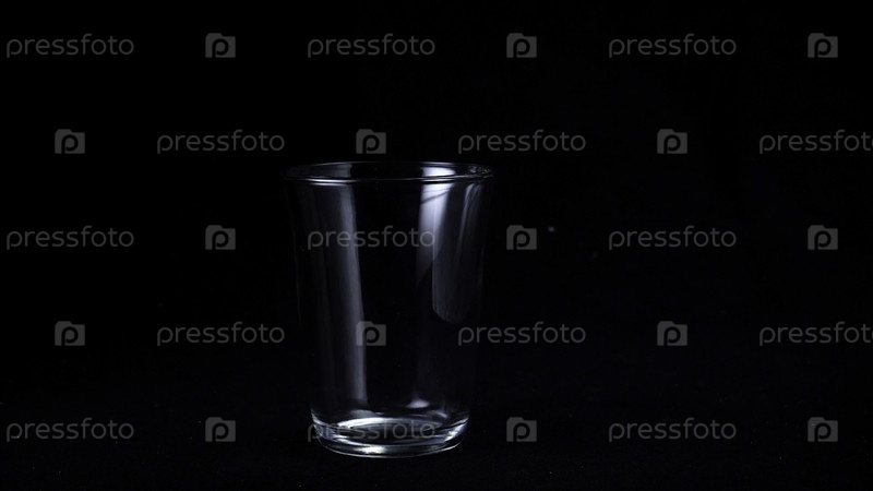 Прозрачная стеклянная чашка на черном изолированном фоне. Каркас. Стекло для чая стоит пустой блеск от слабого белого света на черном фоне