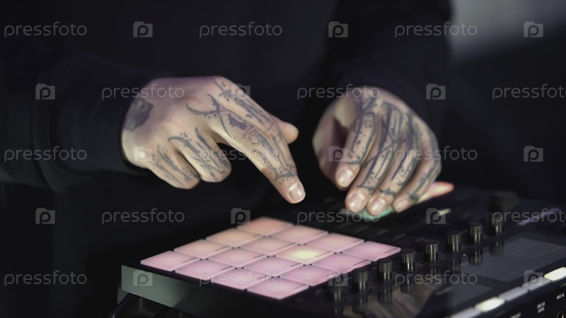 Нажмите цветные квадраты на панели микшера. Арт. Руки в темной комнате набирают код из разноцветных квадратов. Абстрактная музыка на цветной доске микшера
