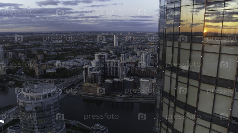 Огромное здание с большими стеклянными окнами. Вид с дрона. Запасные кадры. Прекрасный вид на город с высоты, где можно увидеть дома и огромный длинный офис, можно также увидеть облака немного с облаками и вечером. Качественные 4k кадры