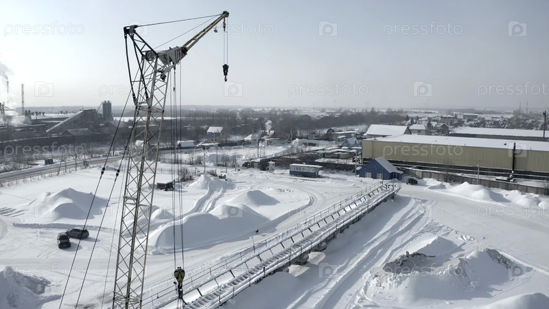 Вид с высоты птичьего полета. Клип. Большой кран, стоящий в производстве, стоит рядом с городом и дорогой, по которой ездят автомобили