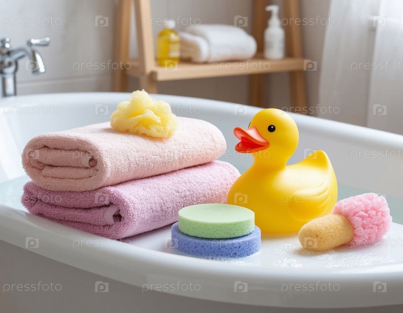Детские принадлежности для купания: ванна, полотенце, утка. Генерируется ИИ