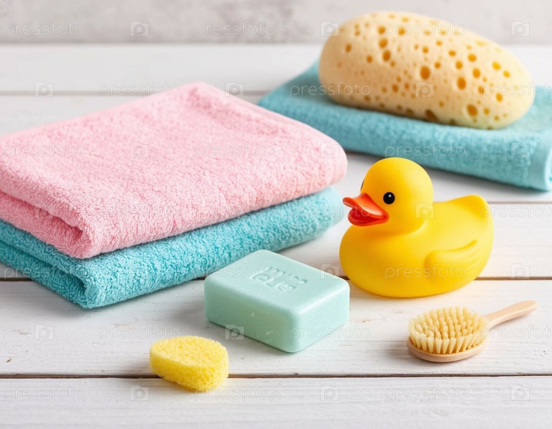 Детские принадлежности для купания: ванна, полотенце, утка. Генерируется ИИ