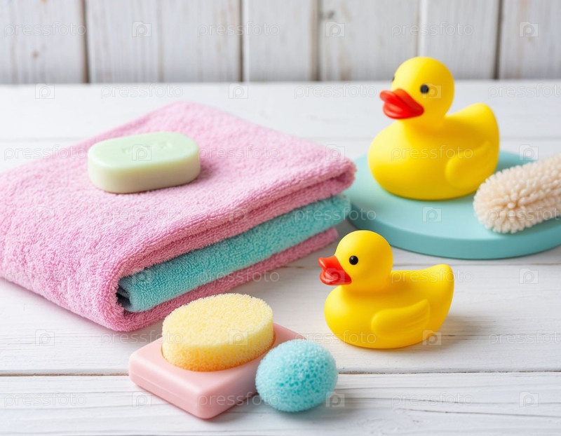 Детские принадлежности для купания: ванна, полотенце, утка. Генерируется ИИ