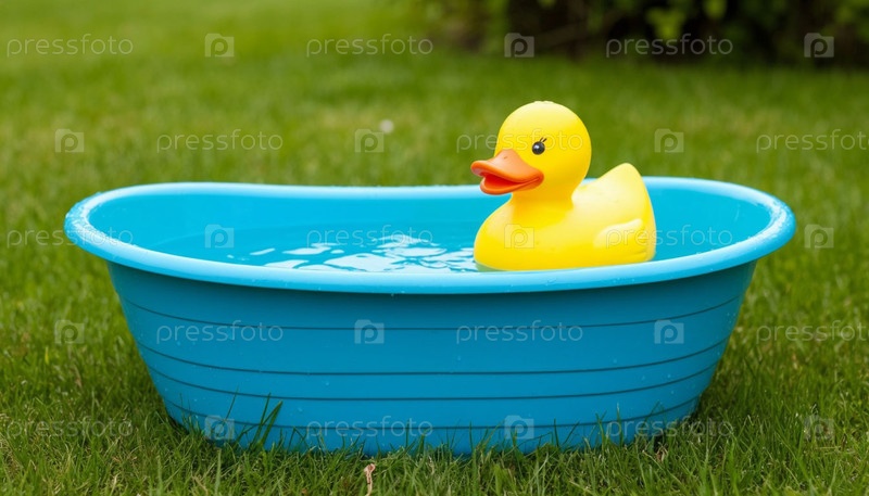 Детская ванна с игрушечной уткой — купание на улице летом. Генерируется ИИ
