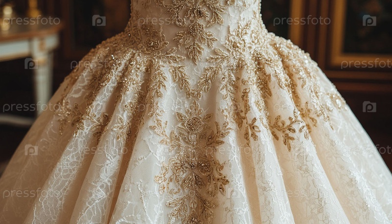 Свадебное платье из кружева и золотой вышивки. Генерируется ИИ