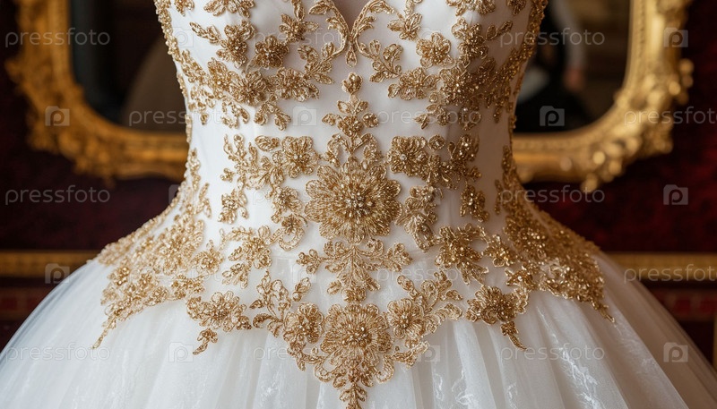 Свадебное платье из кружева и золотой вышивки. Генерируется ИИ