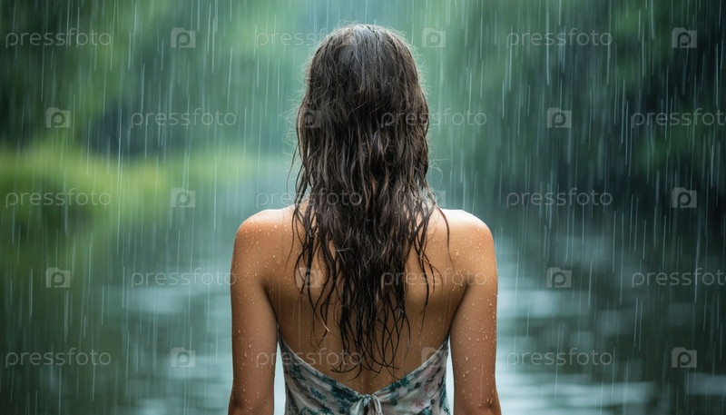 Девушка под дождем, вид сзади. Сгенерированный ИИ