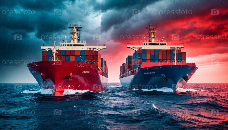 Два грузовых судна обгоняют друг друга во время шторма в море. Гонка в торговой войне. Сгенерированный ИИ