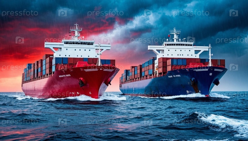 Два грузовых судна обгоняют друг друга во время шторма в море. Гонка в торговой войне. Сгенерированный ИИ