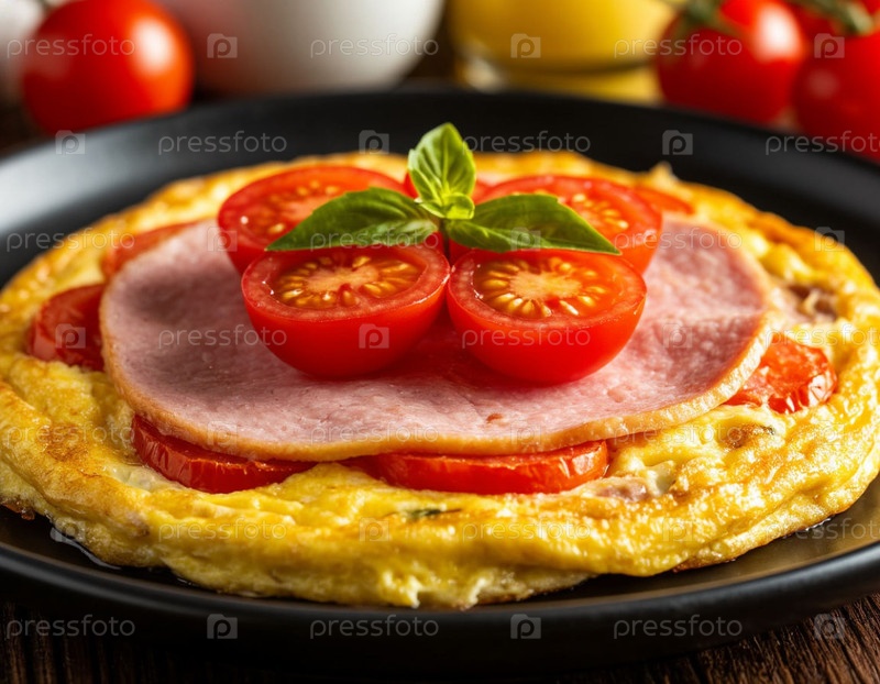 Омлет с ветчиной и помидорами вишни на завтрак. ИИ генерируется
