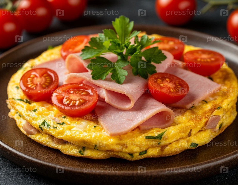 Омлет с ветчиной и помидорами вишни на завтрак. ИИ генерируется