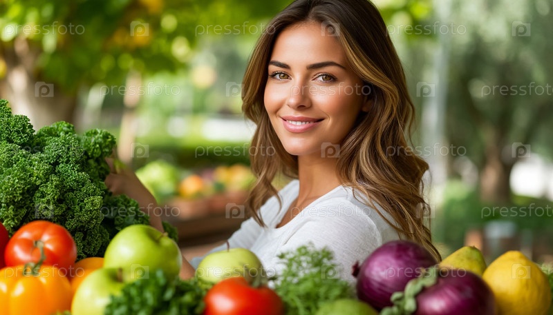 Молодая красивая женщина и здоровое питание. Генерируется ИИ