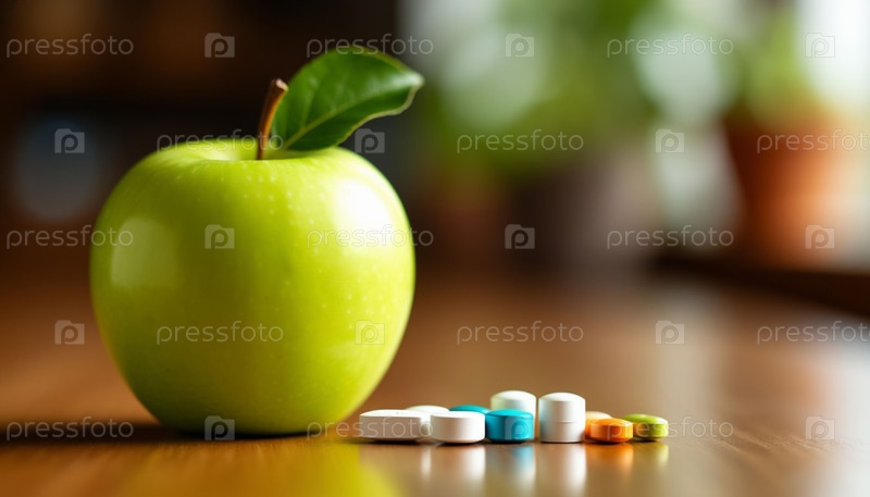Выбор здорового образа жизни, яблока и таблеток на столе. Генерируется ИИ