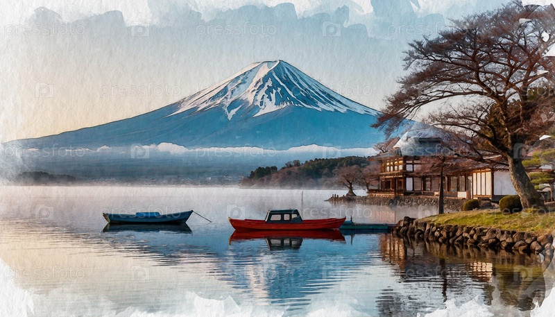 Вид на гору Фудзи в Японии, акварельная иллюстрация, созданная ИИ