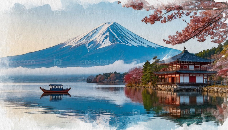 Вид на гору Фудзи в Японии, акварельная иллюстрация, созданная ИИ