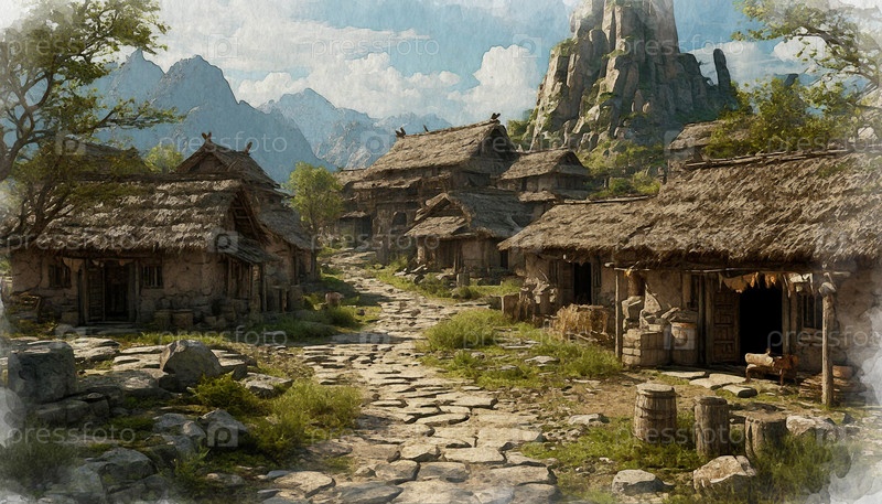 Старая китайская деревня, акварельная иллюстрация, созданная ИИ