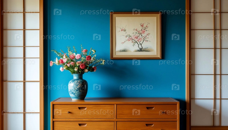 Интерьер комнаты в японском стиле с синими стенами, созданный ИИ