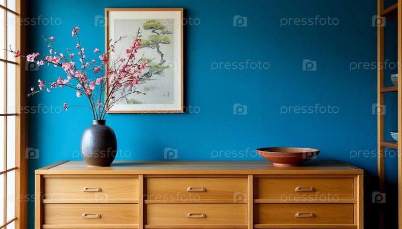 Интерьер комнаты в японском стиле с синими стенами, созданный ИИ
