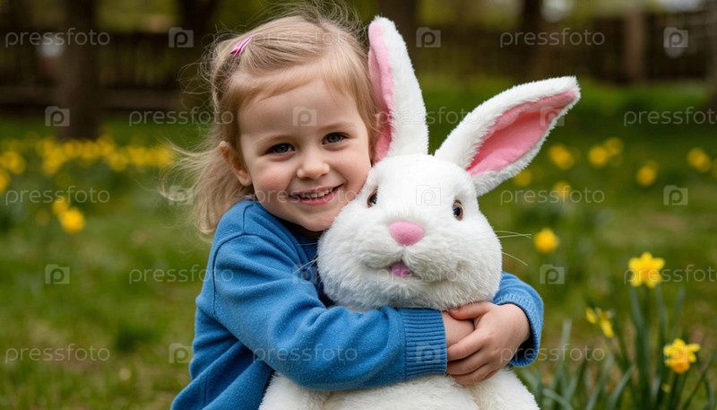Маленькая девочка с огромной игрушкой-кроликом, созданной ИИ