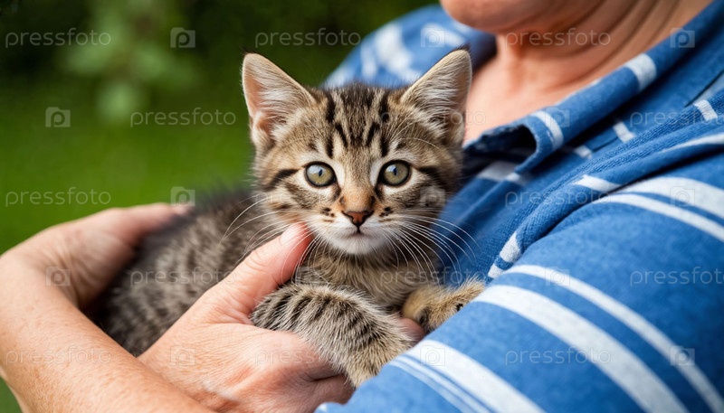 Маленький котенок в объятиях старой женщины, созданный ИИ