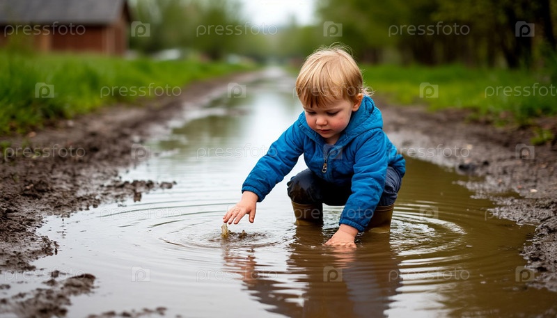 Маленький мальчик играет в весенней луже, созданной ИИ