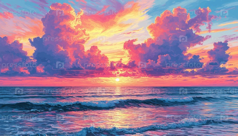 Красочный закат над морем цифровой живописи. Генерируется ИИ