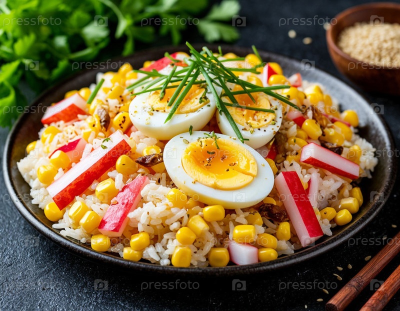 Салат с крабовыми палочками, яйцом, кукурузой и рисом. Сгенерированный ИИ
