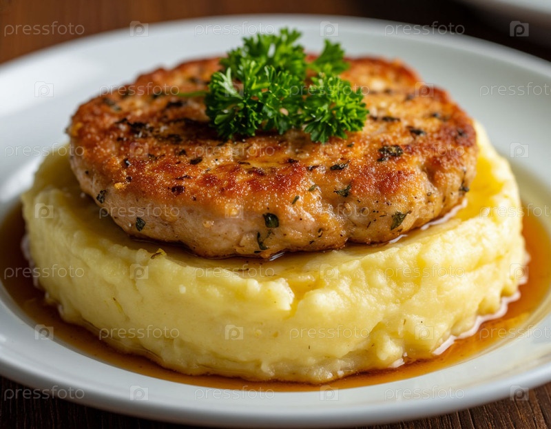 Пюре с куриной котлетой на тарелке. Создано AI