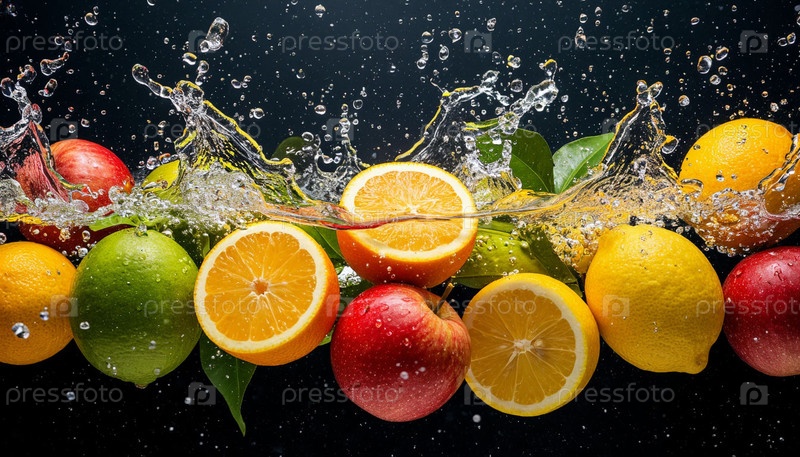 Плоды плещутся в воде на темном фоне. Сгенерированный ИИ