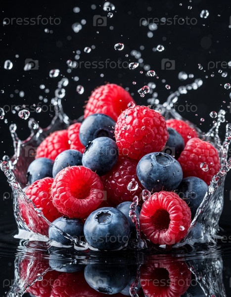 Малина и черника в брызг воды на темном фоне. Генерируется ИИ