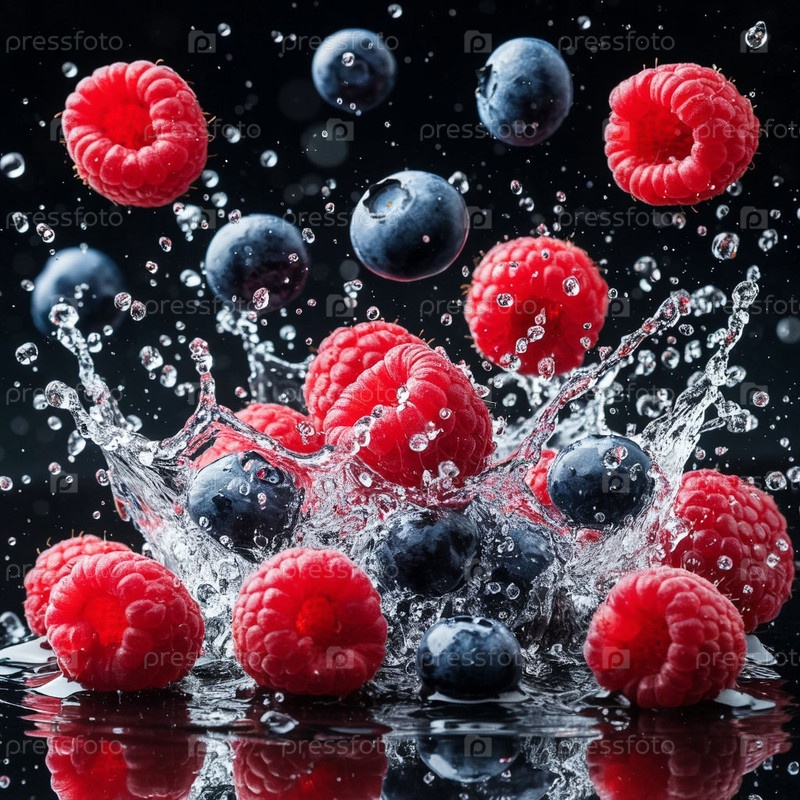 Малина и черника в брызг воды на темном фоне. Генерируется ИИ