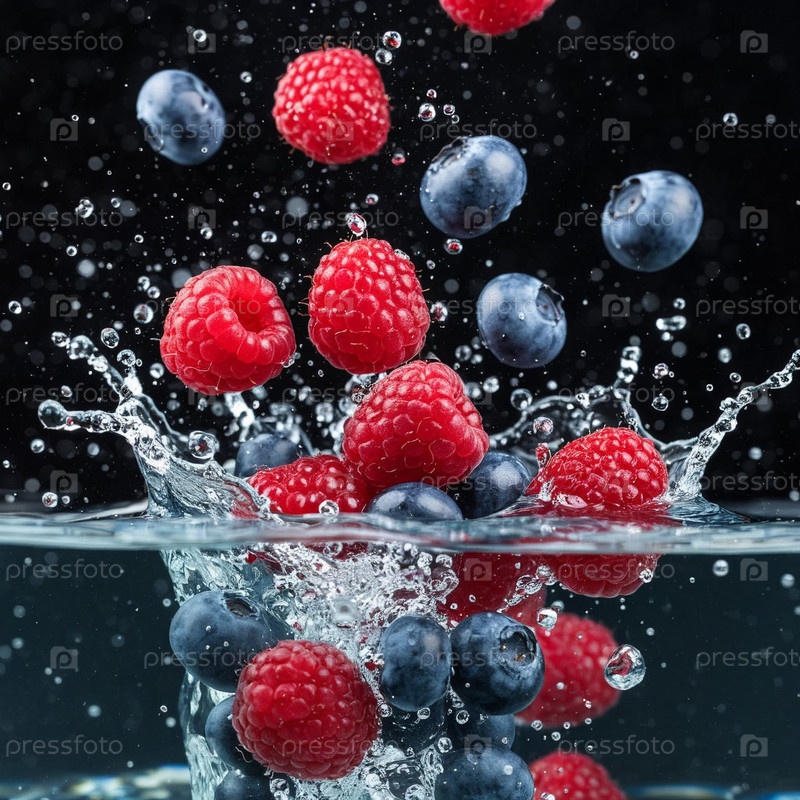 Малина и черника в брызг воды на темном фоне. Генерируется ИИ