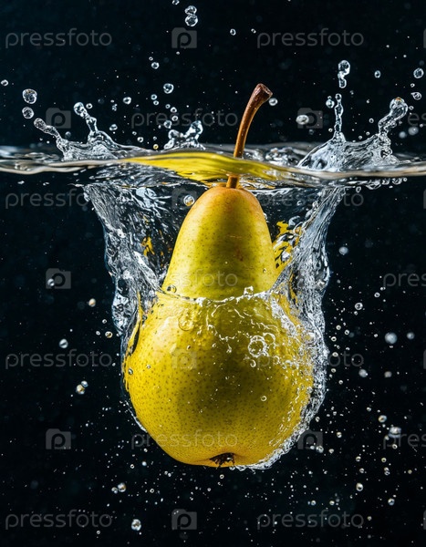 Груша в брызг воды на темном фоне. Сгенерированный ИИ