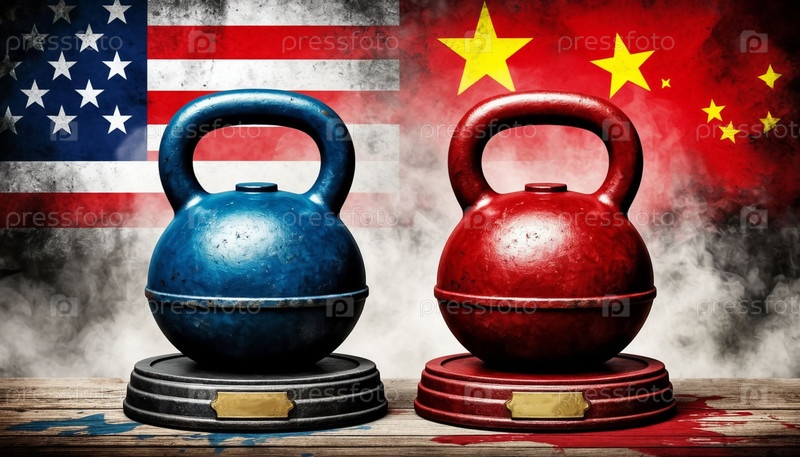 Два тяжелых веса США и Китая на фоне флагов США и Китая. Риск краха мировой торговой системы