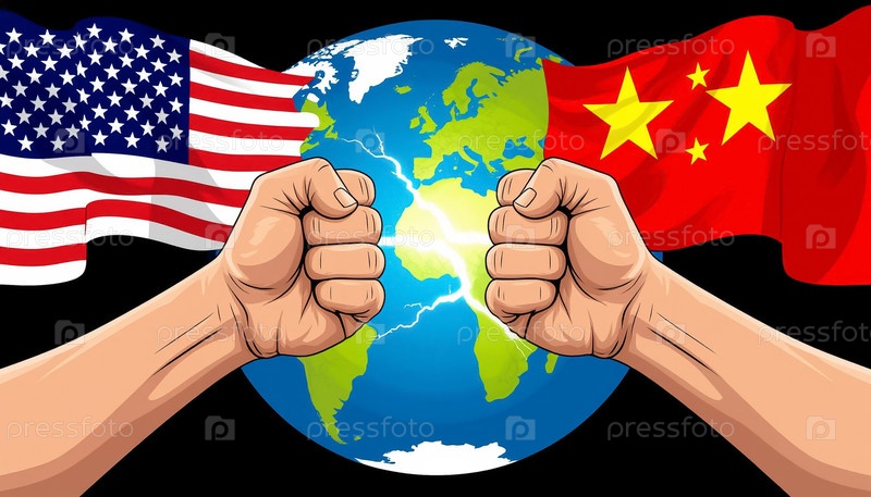 Два кулака США и Китая на фоне флагов борются за превосходство. Риск краха мировой торговой системы