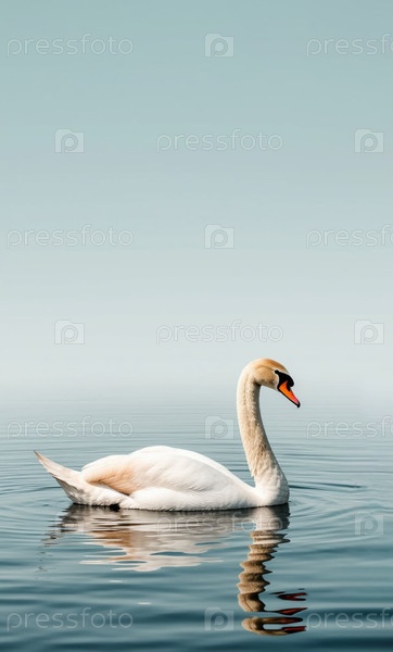 Лебедь с отражением в воде на пастельном серо-голубом вертикальном фоне. Генерируется ИИ