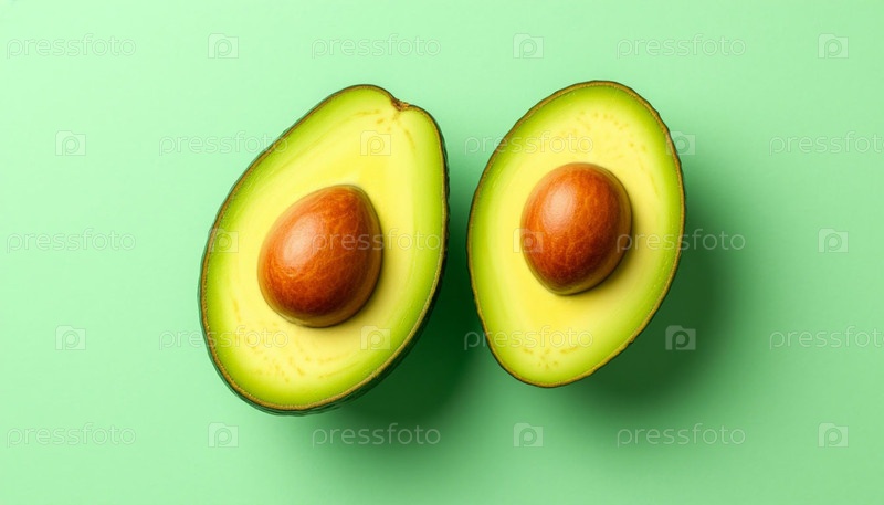 Авокадо наполовину на пастельно-зеленом фоне, копировальное пространство. Генерируется ИИ