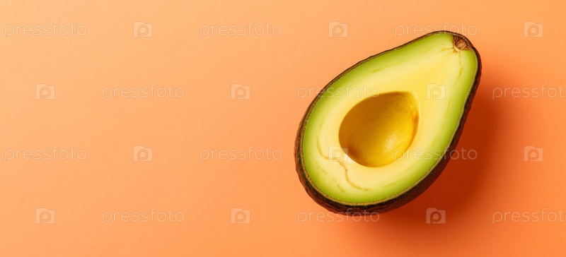 Авокадо наполовину на пастельно-оранжевом фоне, копирует пространство. Генерируется ИИ