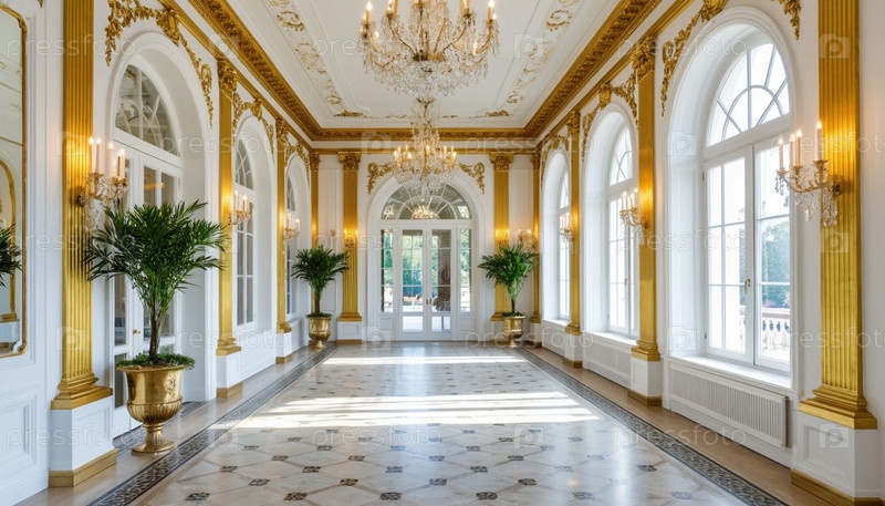 Роскошный дорогой интерьер с белыми и золотыми элементами. Генерируется ИИ