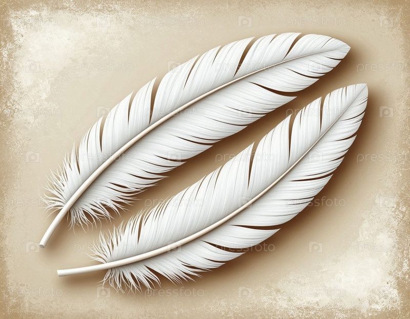 Два белых пера на бежевом фоне, иллюстрация, 3D-рендеринг. ИИ