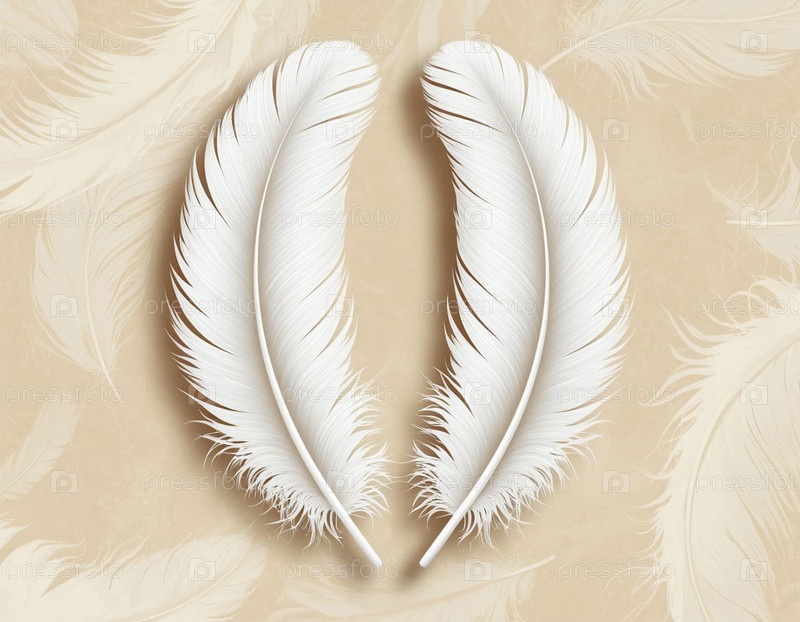 Два белых пера на бежевом фоне, иллюстрация, 3D-рендеринг. ИИ