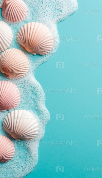 Пастельные ракушки и лазурные волны с пеной. ИИ