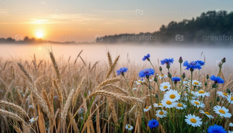 Пшеничное поле и дикие цветы на рассвете в тумане. Сгенерированный ИИ