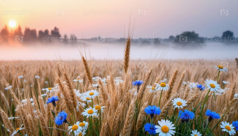 Пшеничное поле и дикие цветы на рассвете в тумане. Сгенерированный ИИ