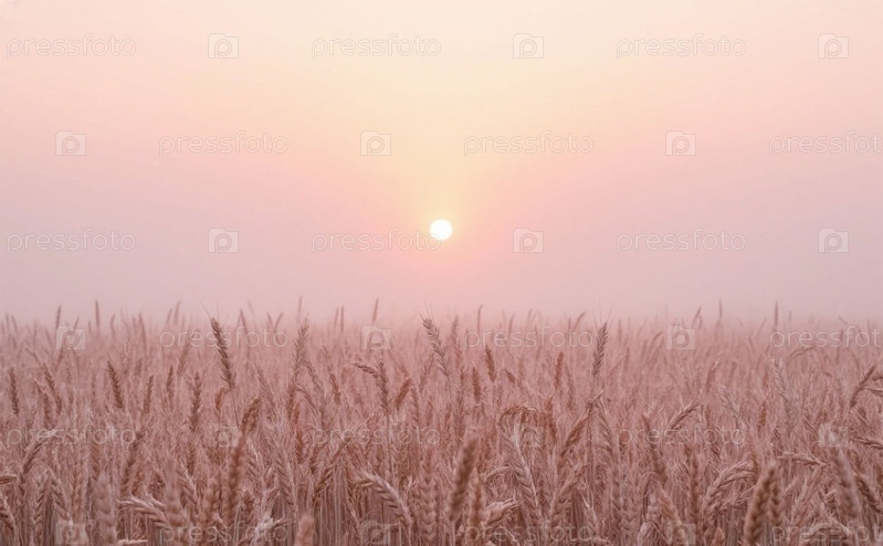 Пшеничное поле на рассвете в тумане Сгенерированный ИИ