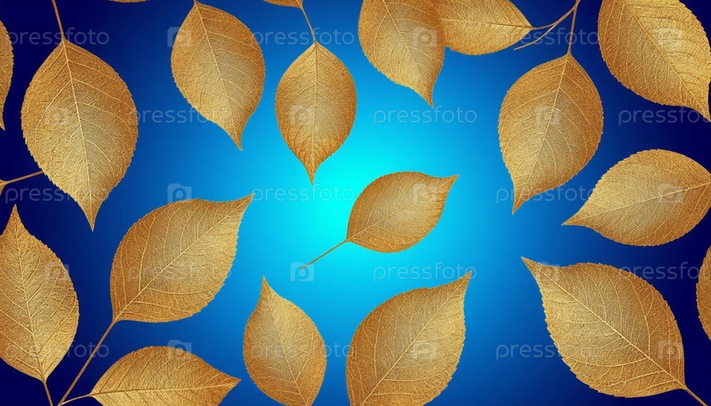 Фоновая иллюстрация золотых осенних листьев на синем фоне. ИИ