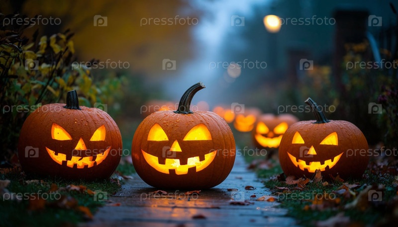 Светящиеся тыквы на пути, Хэллоуин. Сгенерированный ИИ