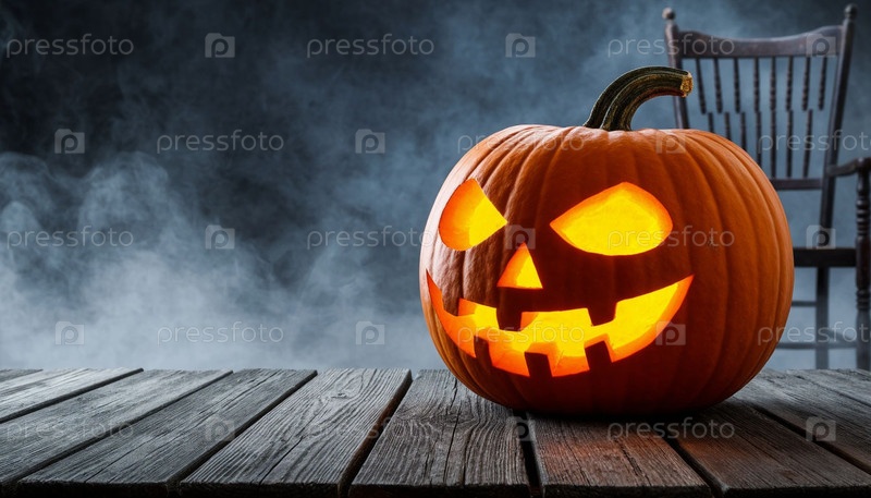 Тыква светится на деревянном столе. Хэллоуин, предыстория. ИИ