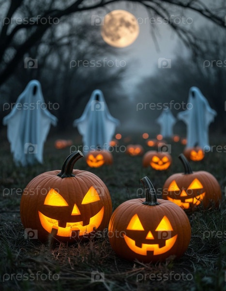 Светящиеся тыквы в лесу и призраки под луной, Хэллоуин. Сгенерированный ИИ