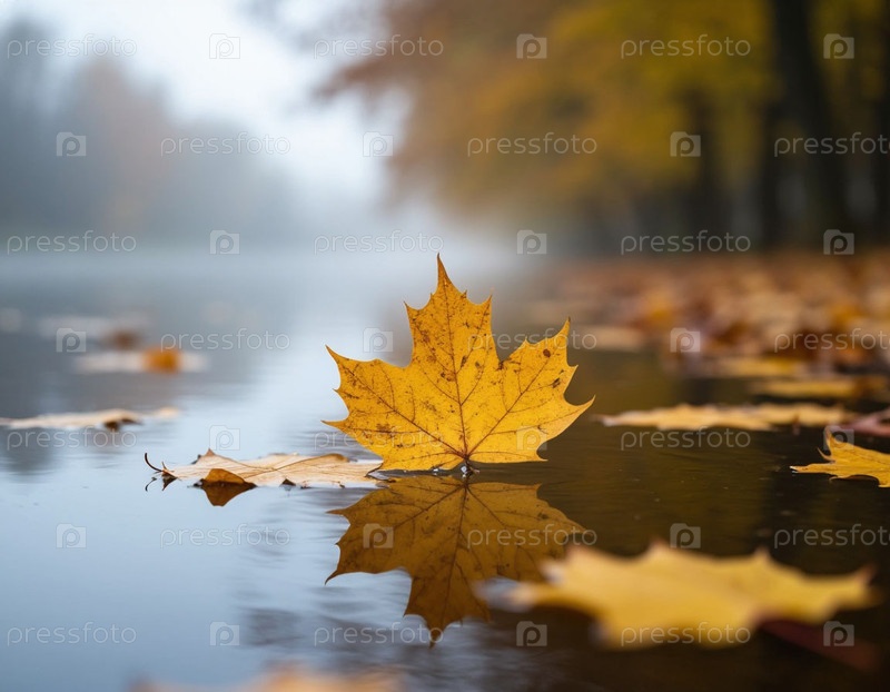 Осенний одинокий лист в луже, размытый фон. Сгенерированный ИИ